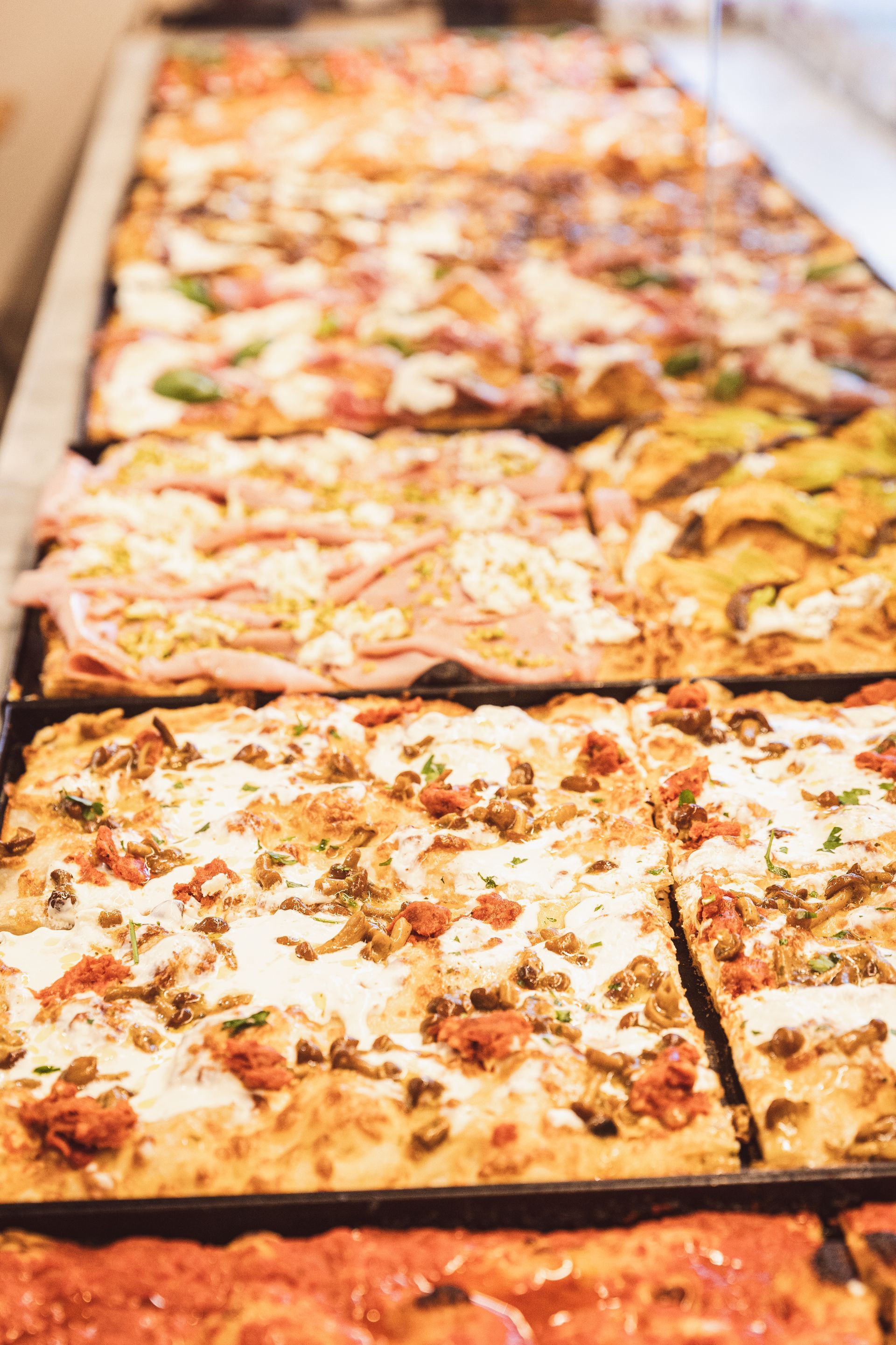La pizza al taglio viene cotta in teglia, venduta a peso e presenta un impasto generalmente più idratato rispetto alla pizza tonda tradizionale.